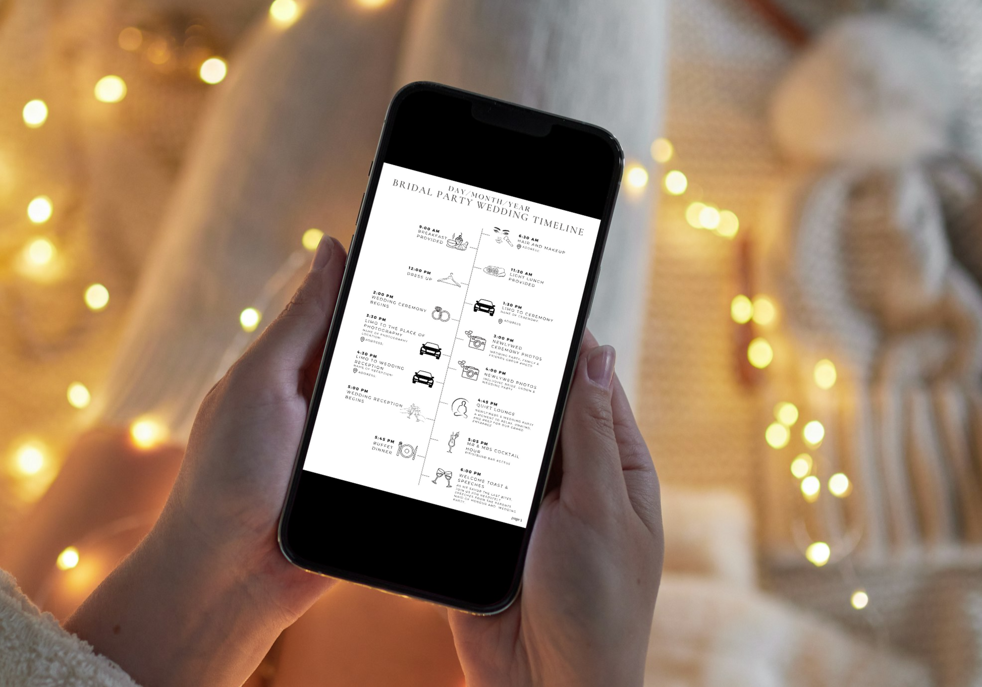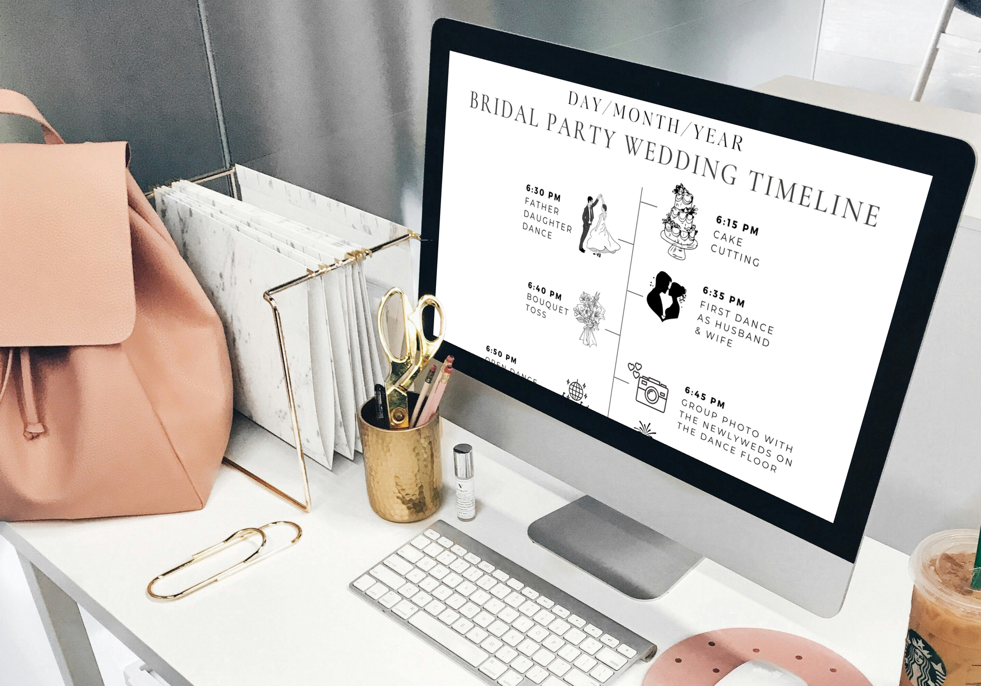 Streamlined Wedding Timeline: Specifically designed for bridal parties, our wedding timeline template keeps everyone in sync with important wedding events. Featuring symbols like wedding cakes, photography, makeup, and more, it's easy to understand and follow.